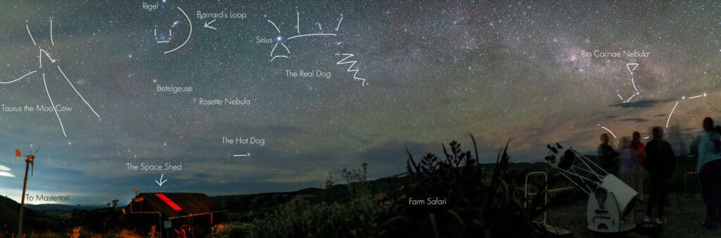 Every summer, the Milky Way arches above the Eastern Wairarapa hills — from the Southern Cross through to Vela, Canis Major, Orion, Taurus and Aries the Ram.
