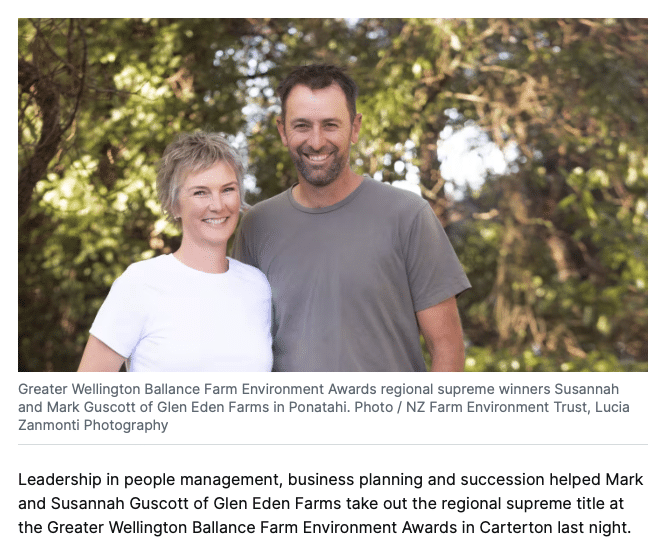 We’re very proud to share the news that our business partners and hosts, Susannah and Mark Guscott of Glen Eden Farms, have won the Greater Wellington Ballance Farm Environment Award!