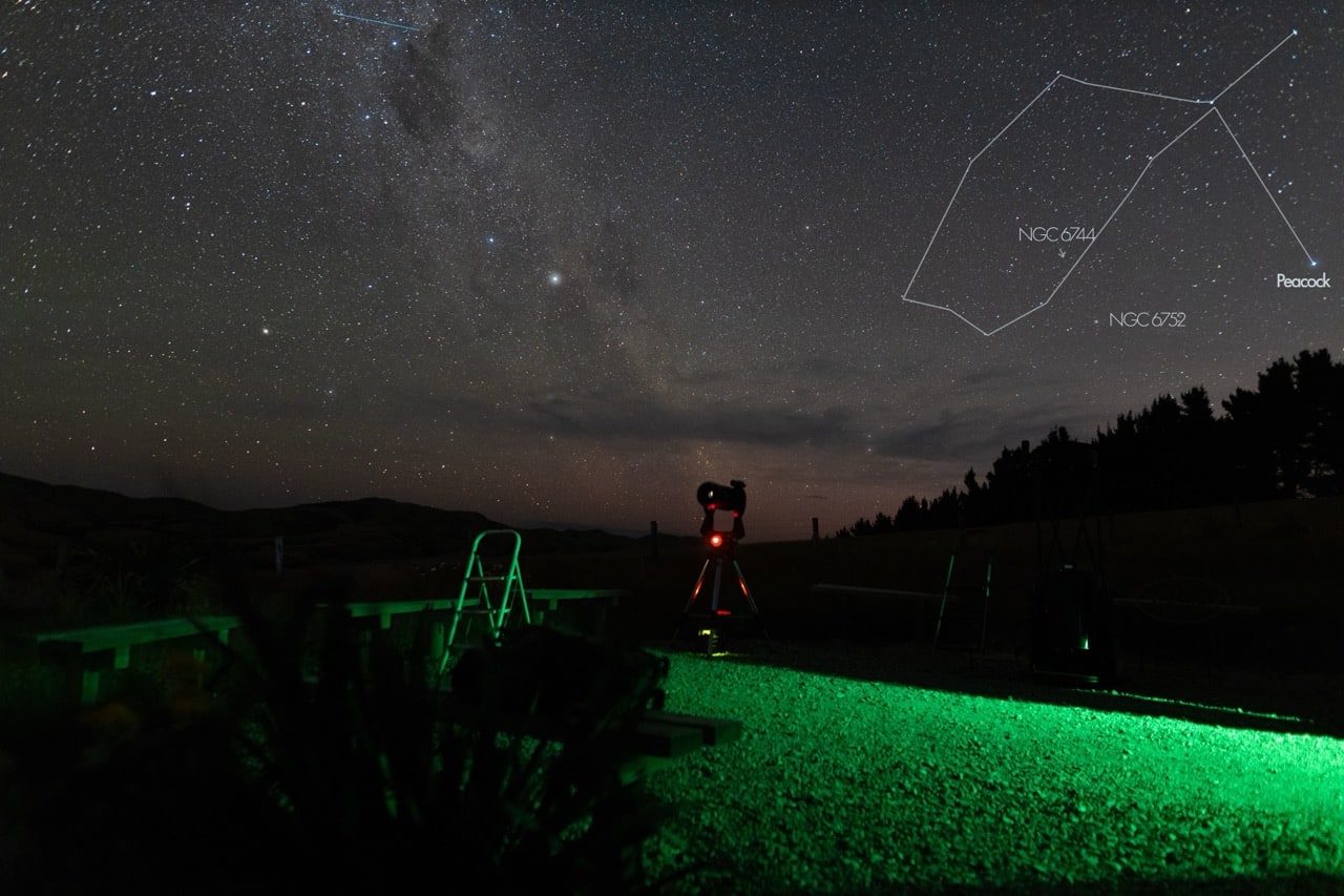 The rest of the constellation comprises less prominent stars. It’s in the group of constellations surrounding the South Celestial Pole – with Apus, Octans and Chamaeleon in the middle, and Pavo is in the next ring of constellations out. It sits between Octans and Sagittarius and is circumpolar if viewed from Star Safari Observatory.